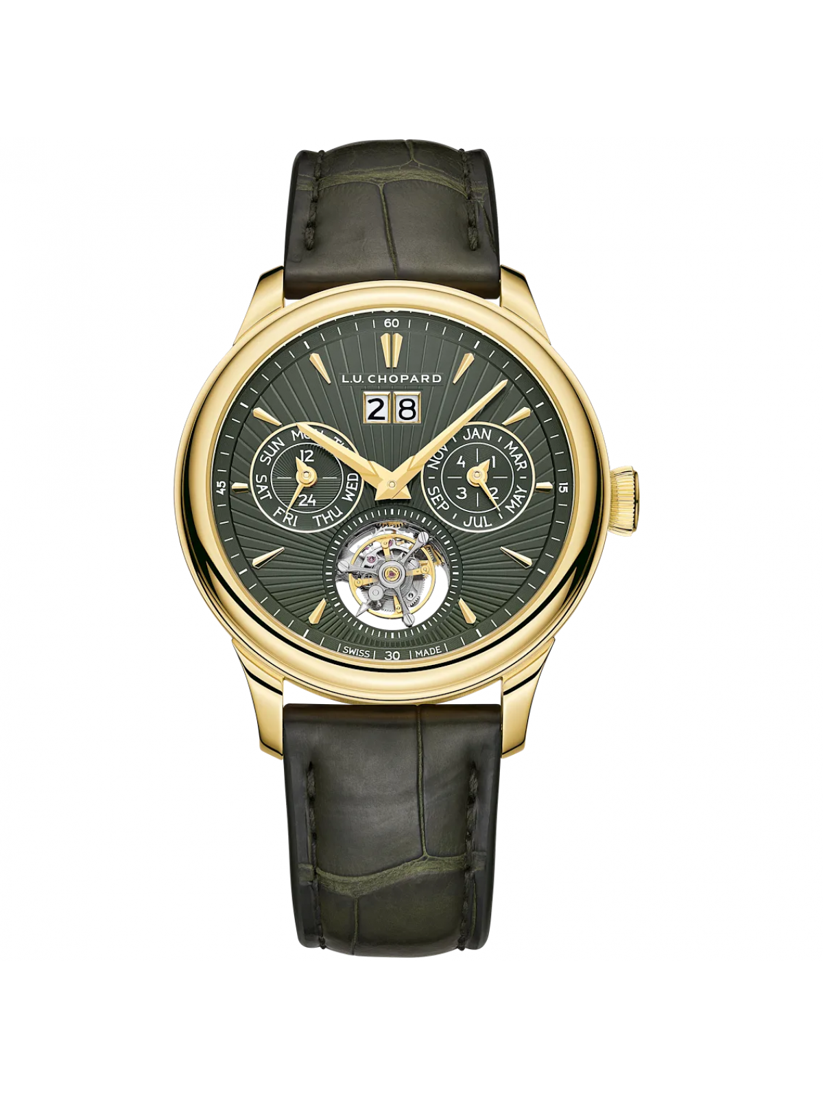 Эти часы — настоящий мастеркласс механики: внутри скрыт автоподзаводной механизм Chopard L.U.C Calibre 96.36-L, который обеспечивает запас хода до внушительных 65 часов. А дополнительные функции — вечный календарь, GMT и турбийон — делают их не только красивыми, но и очень функциональными. Представьте: вечный календарь, который сам знает, какая сегодня дата, и возможность легко переключаться между часами разных часовых поясов.