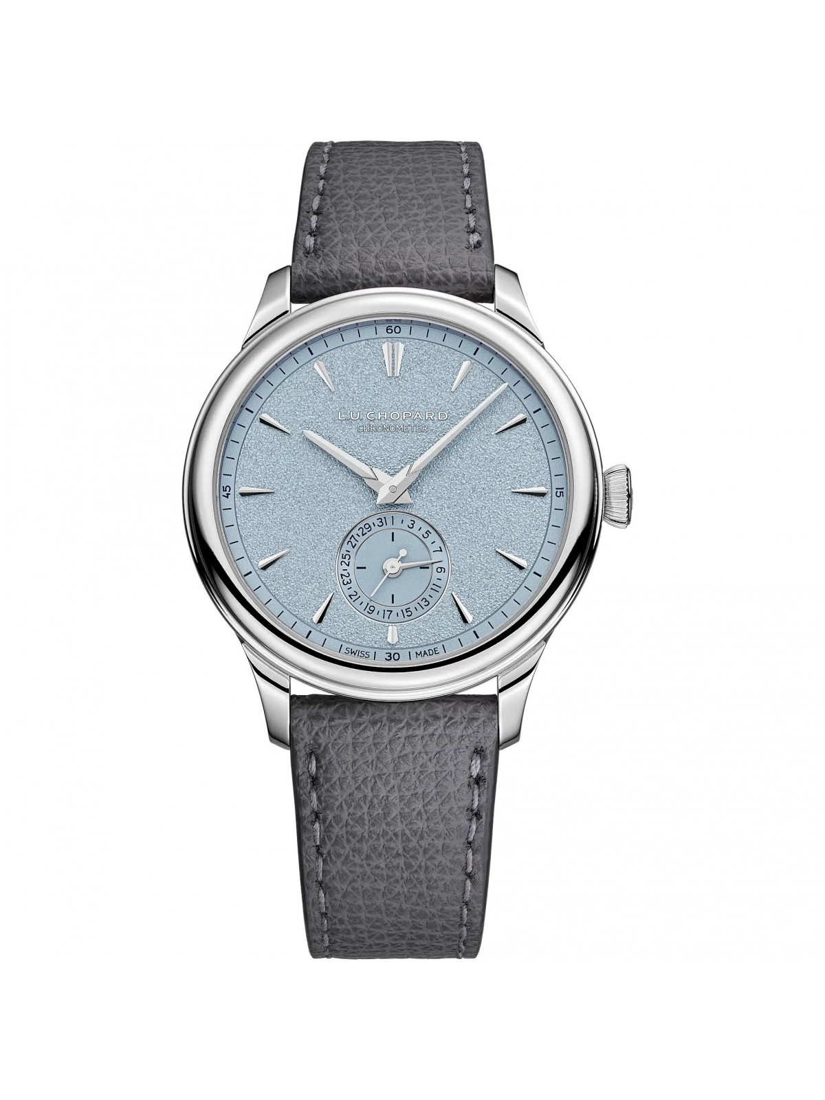 Ключевые характеристики: - Тип: мужские часы - Механизм: ручной завода, Calibre 98.09-L - Запас хода: 216 часов - Диаметр корпуса: 39 мм - Материал корпуса: платина 950 пробы - Циферблат: голубой - Браслет/ремень: натуральная кожа серого цвета - Функции: часы, минуты, секунды, дата - Коллекция: L.U.C - Референс: 161954-9001 - Год релиза: 2025 - Комплектация: полный комплект