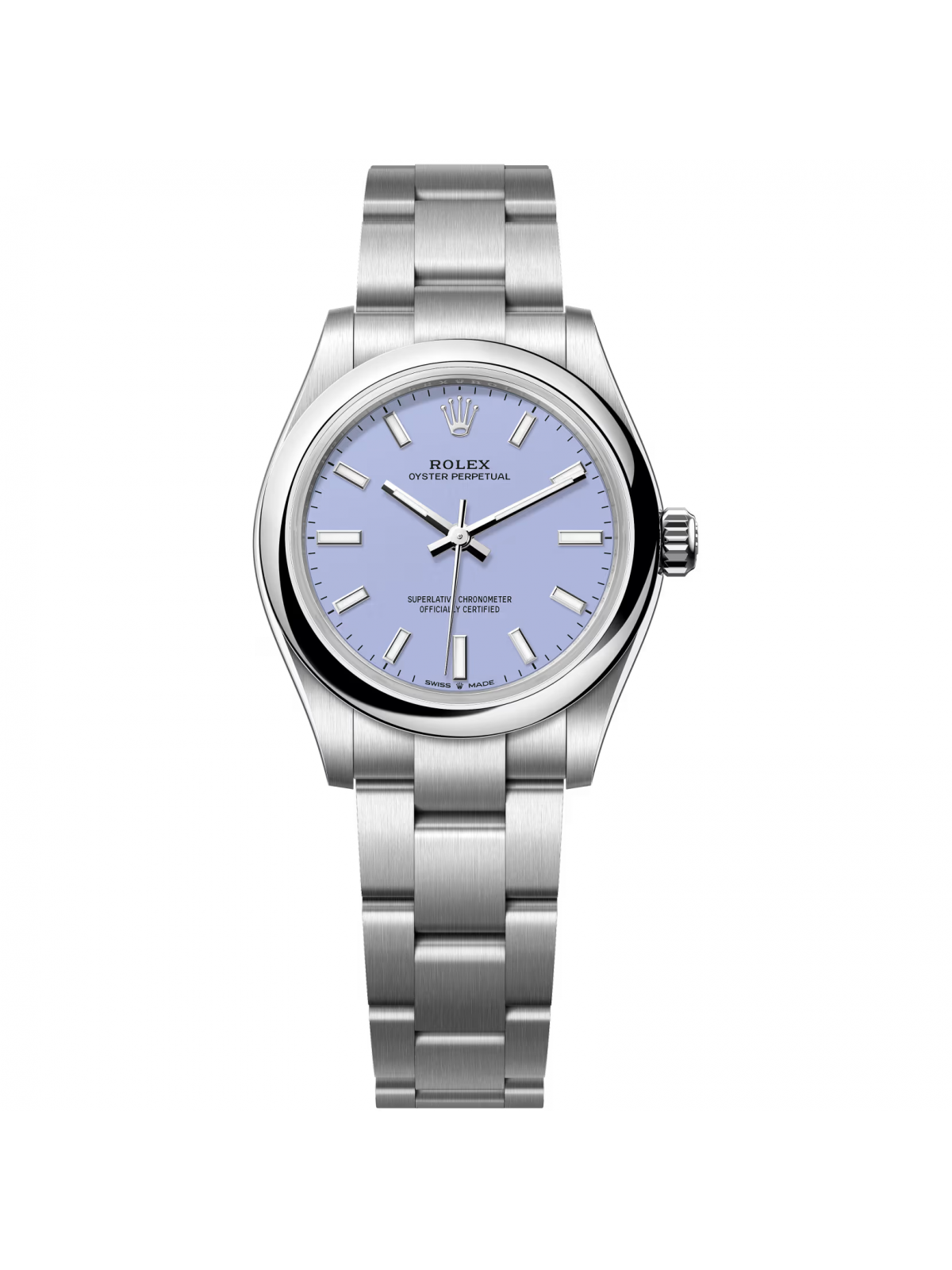 Корпус из нержавеющей стали, выполненный по классической коллекции Oyster Perpetual, идеально сочетается с лавандовым циферблатом — нежным, утонченным и в то же время ярким акцентом. Размер корпуса 31 мм делает часы комфортными и идеальными для женской руки, а водозащита 100 метров позволяет не бояться дождя или случайных брызг — их можно носить повседневно и в любые ситуации.