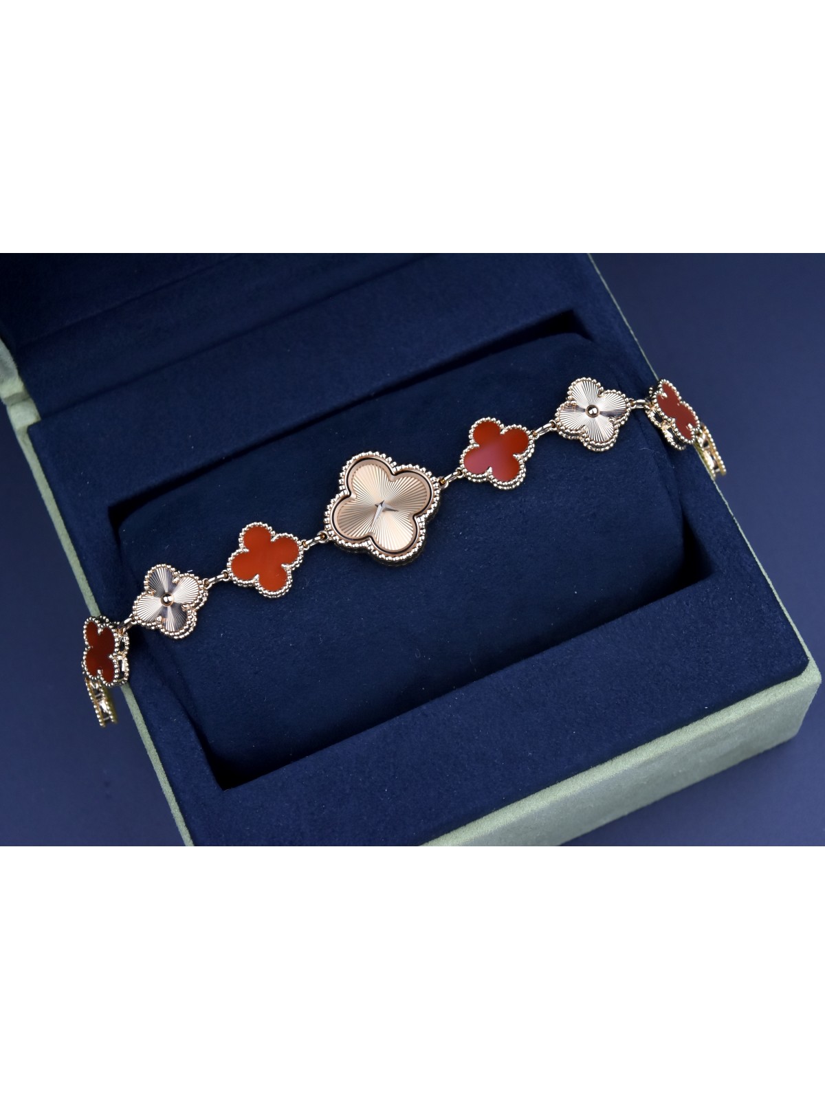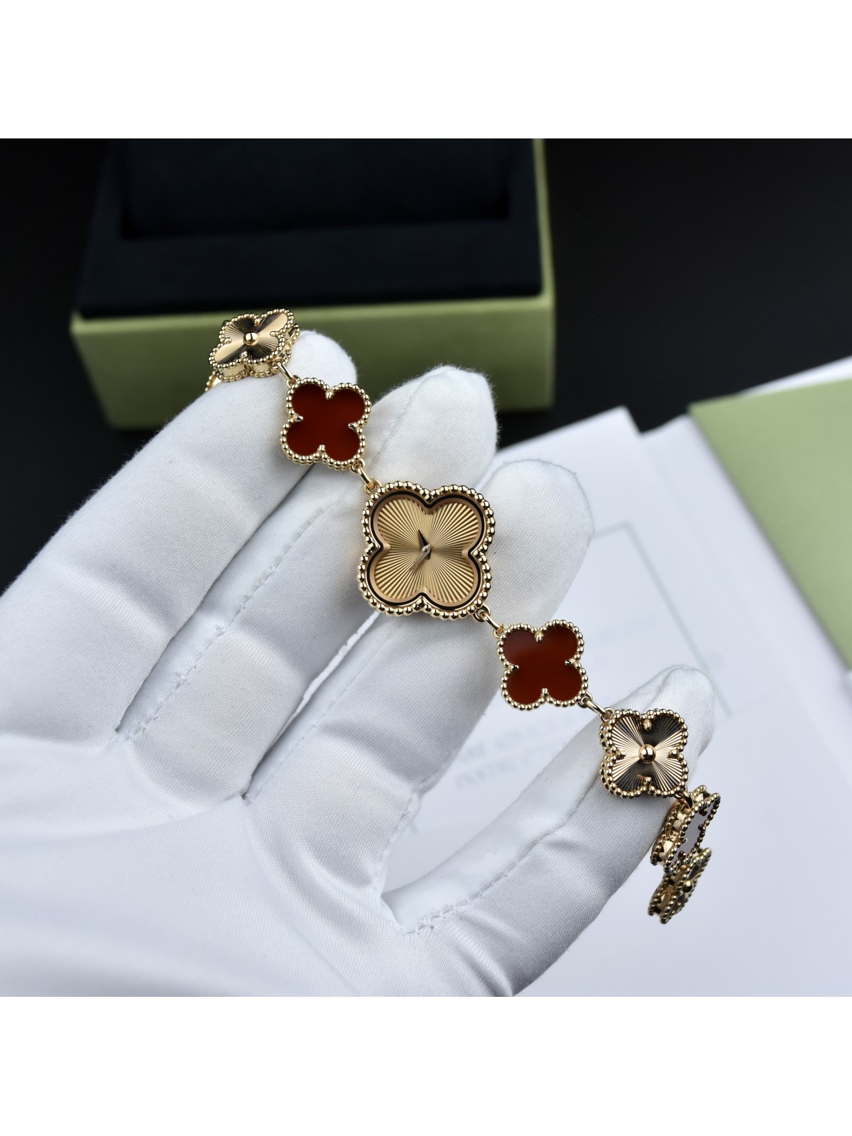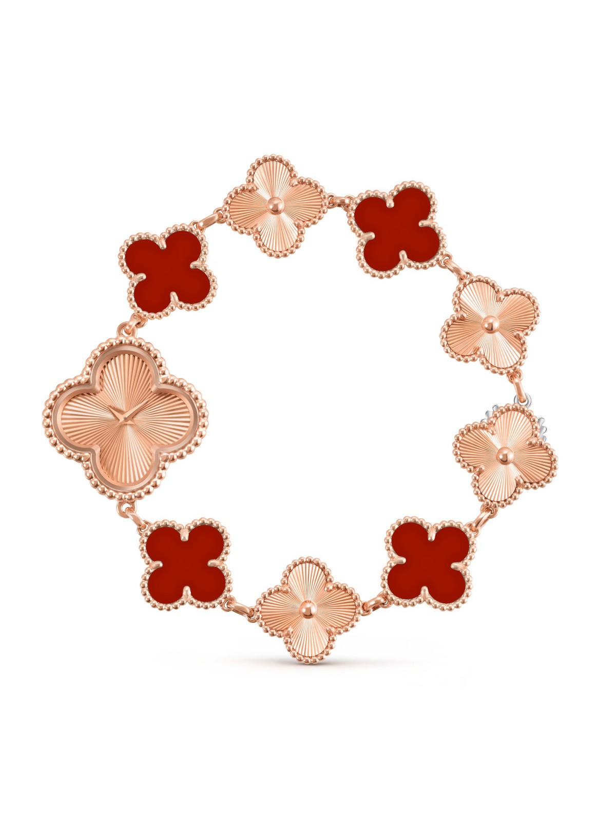 Van Cleef & Arpels Arpels Sweet Alhambra 22.7 mm VCARPBLY00 — это часы, которые говорят за счёт материалов и символики. Корпус из розового золота 18 карат с четырьмя вставками из сердолика создаёт роскошный, но не кричащий образ. Мотив Sweet Alhambra — четырехлистный клевер — в этой модели звучит как знак удачи и утончённой элегантности.