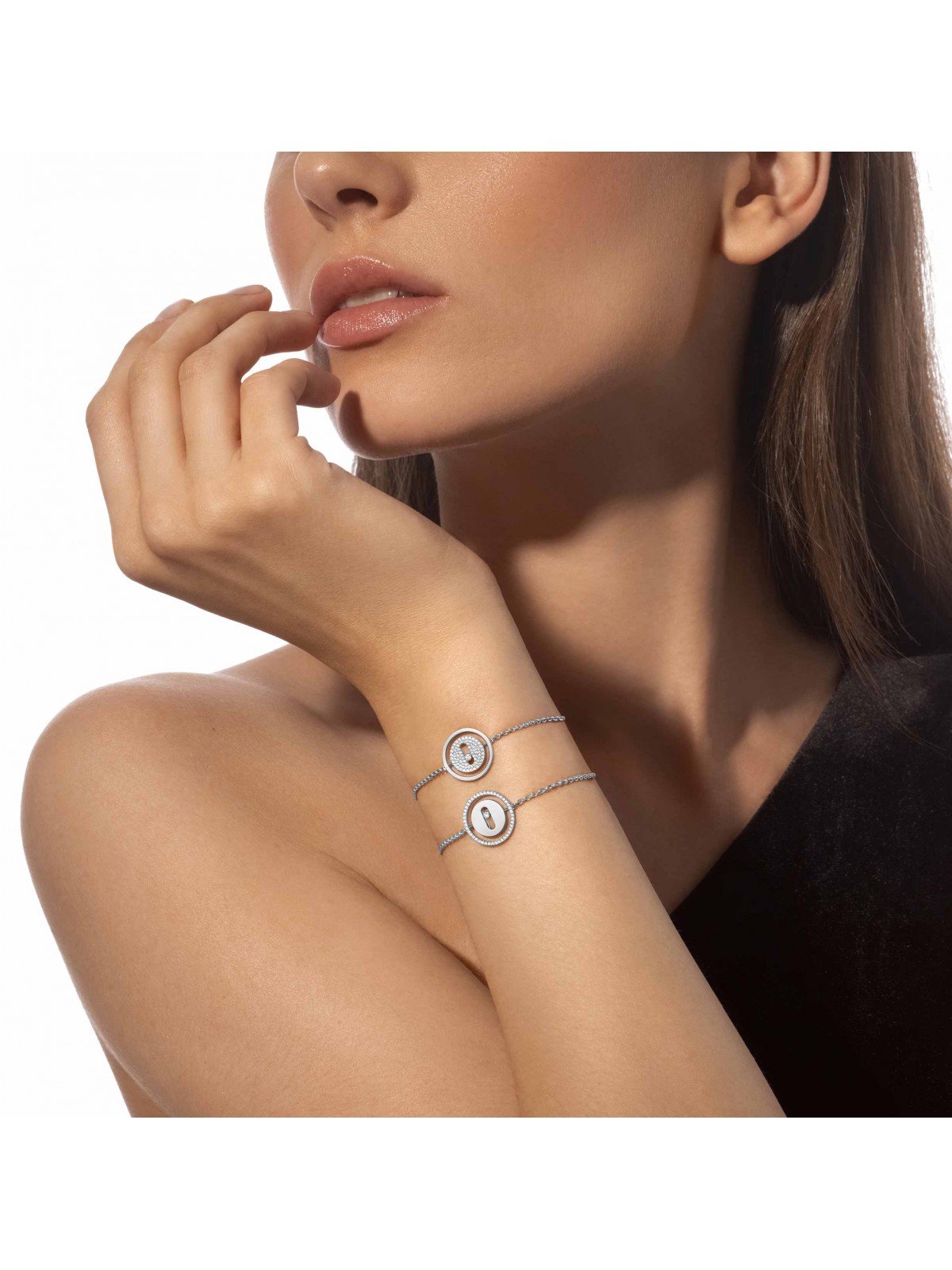 Браслет Messika Lucky Move SM 07540-WG — стильный акцент на каждый день и для особых случаев. Белое золото 18 карат сияет ровной гармонией с бриллиантами общей массой около 0.18 карат. Фирменный шарм Move в этом браслете — бриллиант, который будто живёт на цепочке и ловит свет с каждого движения кисти. Эффектный, но не кричащий — идеален для тех, кто любит лаконичный роскошь.