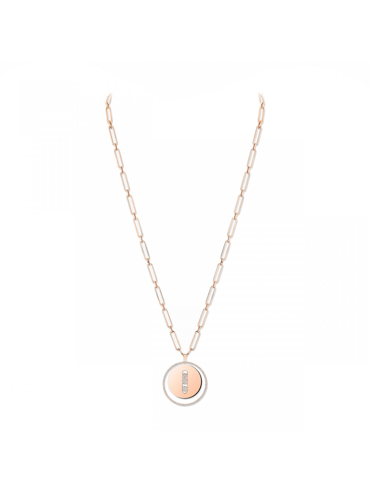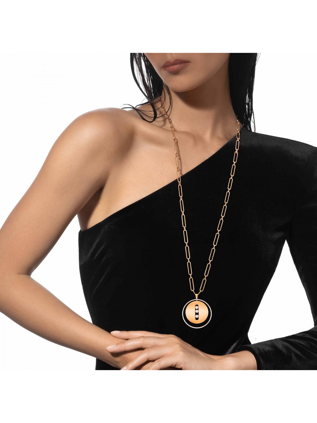 Колье Messika Lucky Move Long Necklace LM 10126-PG — настоящий знак внимания к себе. Это украшение из коллекции Move, которое сочетает в себе роскошь розового золота 750-й пробы и искру бриллиантов. Диаметр кулона 43 мм и общая огранка ~1.69 карат делают образ заметным, но элегантным.