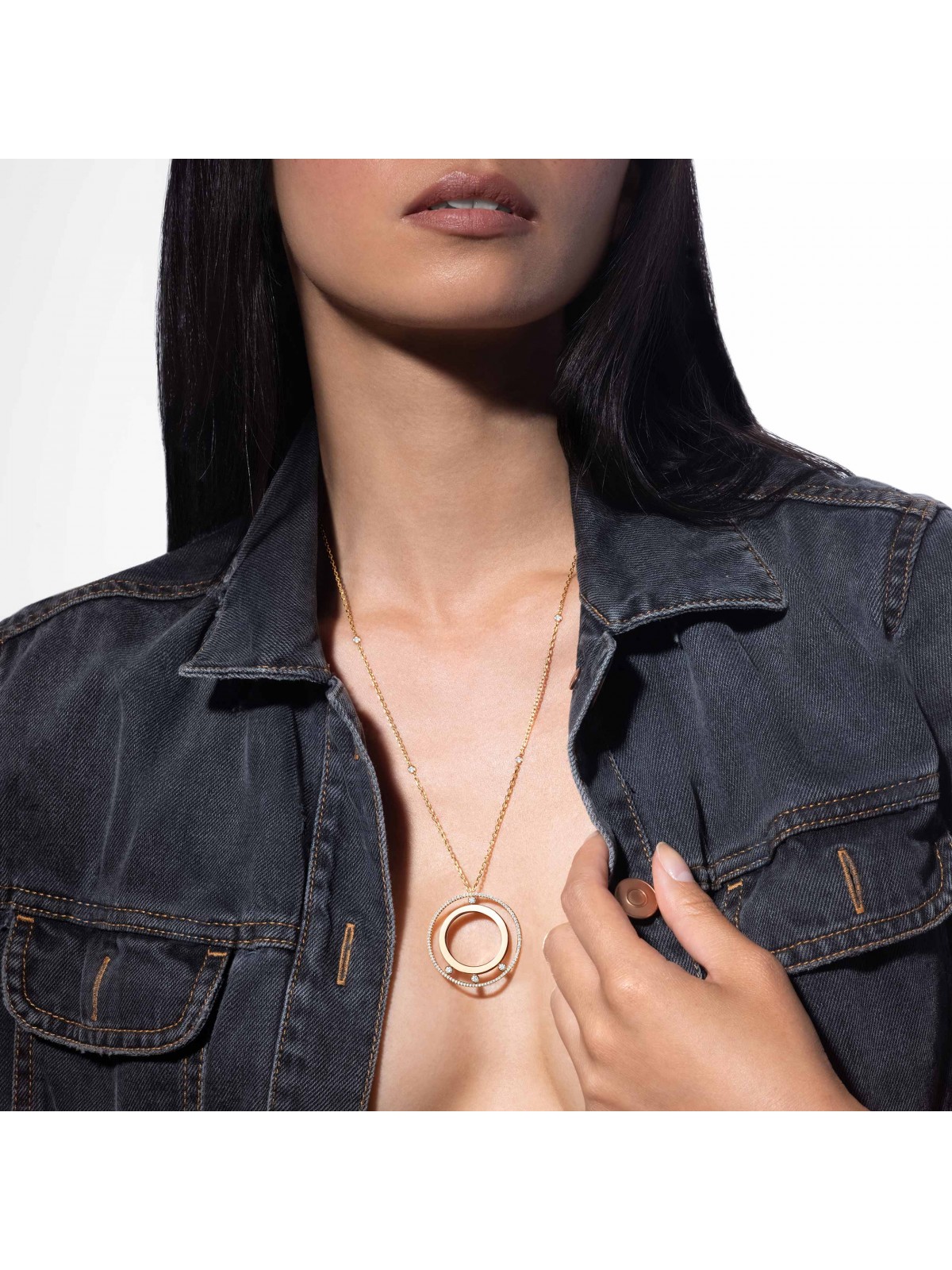 Колье Messika Move Romane Long Necklace 11169-YG — настоящее заявление для стильной женщины. Это украшение из желтого золота 750 пробы, которое тянется длинной цепочкой 80 см и держит на себе кулон диаметром 3,5 см, украшенный бриллиантами суммарно около 0,78 карат.