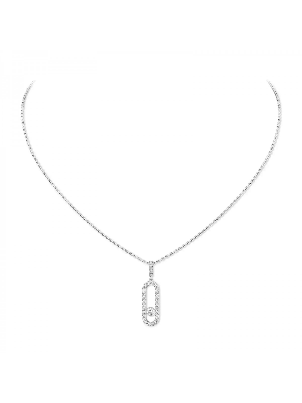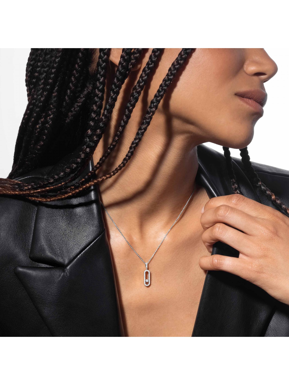 Колье Messika Move Uno Pave LM 12058-WG — это удачный баланс минимализма и роскоши. Белое золото 750 пробы, цепочка длиной 45 см сидит на шее нежно и аккуратно, а центр украшает россыпь бриллиантов суммарно около 0.35 каратов в pave-обработке. Это изделие из коллекции Move, которая славится чистым блеском и современным характером.